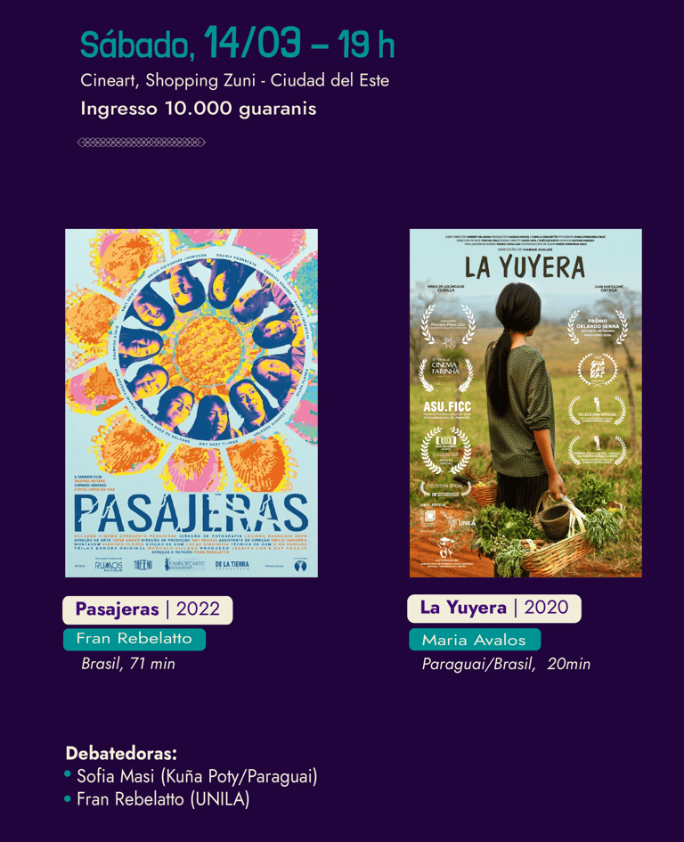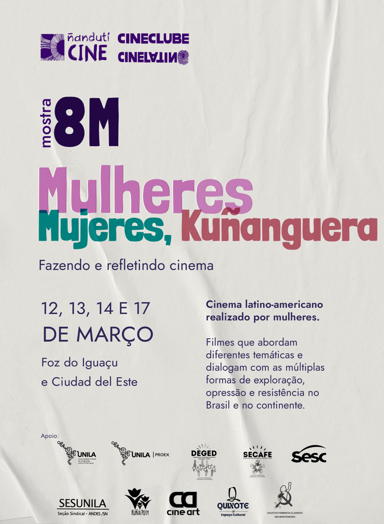 No mês de Março, Foz do Iguaçu e Ciudad del Leste receberá uma diversa programação de cinema realizado por mulheres latino-americanas com filmes que abordam diferentes temáticas, relacionando as variadas formas de exploração, opressão e resistências no Brasil e no continente. A programação integra o calendário de atividades pela passagem do Dia Internacional das Mulheres trabalhadoras (8M) e é uma parceria entre a Produtora Ñanduti Cine, o projeto de extensão ‘Cineclube Cinelatino’, o Coletivo Feminista Classista Ana Montenegro (CFCAM), a SESUNILA, o projeto de pesquisa da Unila ‘Observatório latino-americano de Cinema Entre-Fronteiras’ (OLACEF), a PROEX, o Espaço Cultural Quixote de Foz do Iguaçu, o SESC-Foz do Iguaçu e o coletivo feminista Kuña Poty e o CineArt, ambos do Paraguai.