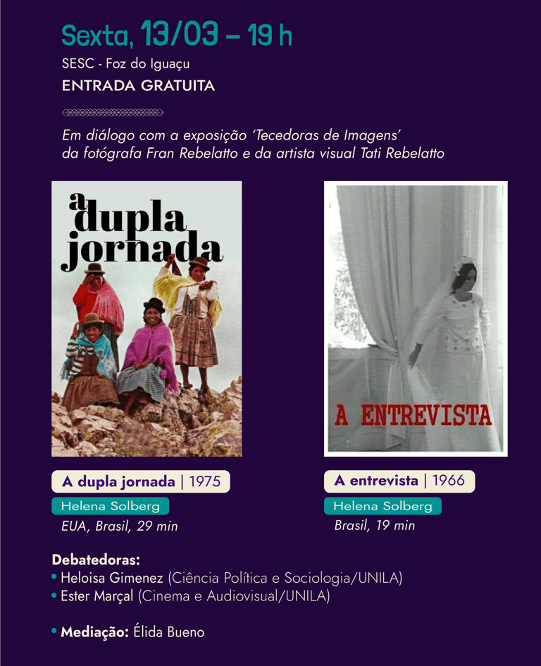 Em diálogo com a exposição ‘Tecedoras de Imagens’ da fotógrafa Fran Rebelatto e da artista visual Tati Rebelatto que acontece no SESC, em Foz do Iguaçu, vamos assistir duas obras da cineasta brasileira Helena Solberg, com posterior debate.