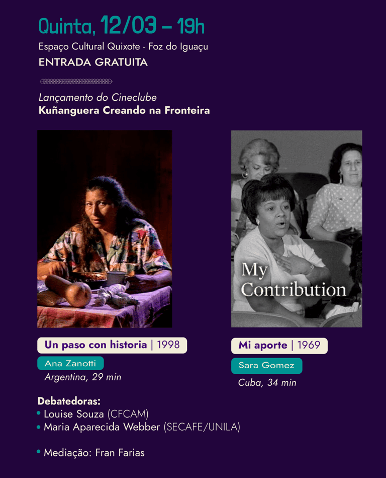 O Cineclube ‘Kuñanguera Creando na fronteira’ acontecerá mensalmente no Espaço Cultural Quixote trazendo diferentes filmografias de realizadoras mulheres, em especial de realizadoras latino-americanas. Na primeira edição do Cineclube conheceremos duas cineastas do nosso continente, a pioneira de Misiones, na Argentina, Ana Zanotti e uma das cineastas pioneiras cubanas, Sara Gomez. Ambas cineastas em suas obras trazem reflexões sobre os desafios estruturais das mulheres trabalhadores (as) em nosso continente.